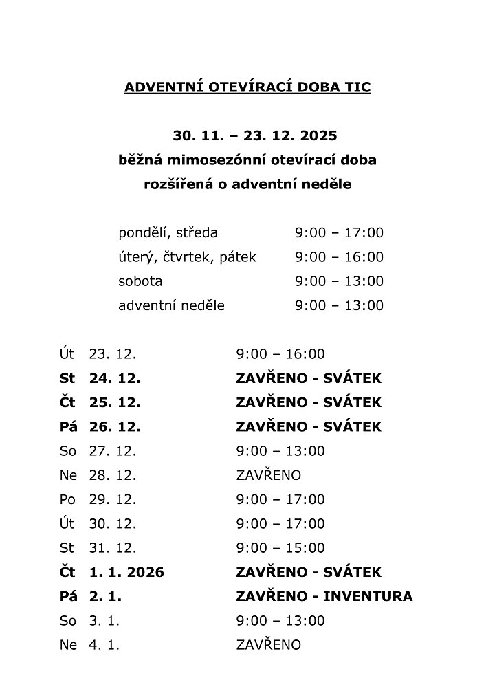 Prosincová otevírací doba Turistického informačního centra