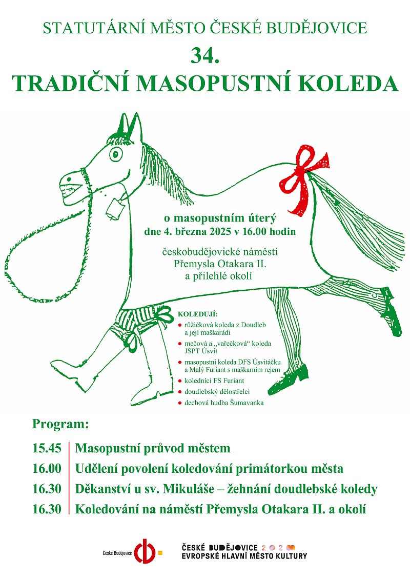 The procession begins at the South Bohemian Theatre and the whole program is in its immediate vicinity, while enjoying the masquerade procession of colorful masks, blessing carols and praise of the Masopust. The accompanying program provides the best South Bohemian folk ensembles whose art and performances create a unique event from the Budweiser carnival that crosses the border of the region.