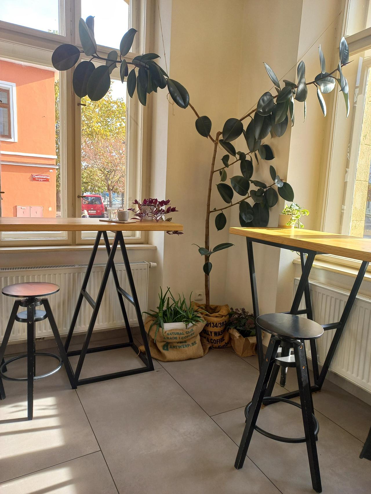 Při příznivém počasí nabízí také venkovní posezení pře vstupem do kavárny.