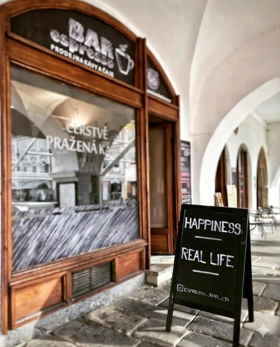 Před podnikem jsou navíc dva venkovní stolky na stání, ideální pro krátké zastavení a vychutnání si šálku kávy.