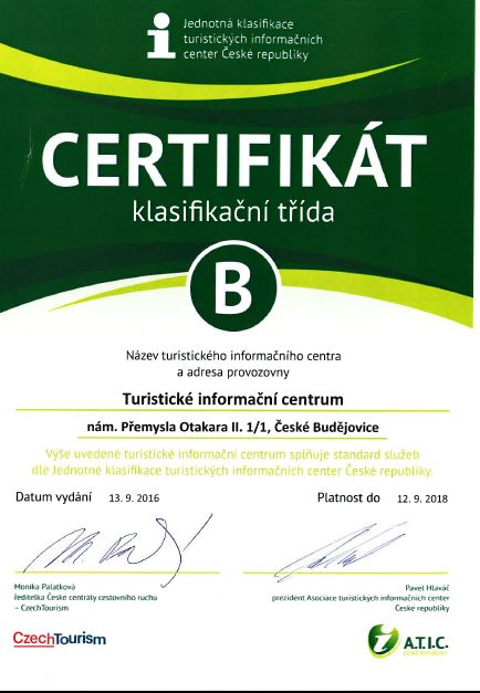 - Das Infozentrum wurde mit dem Zertifikat der Assoziation der Tourismusinformationszentren der Tschechischen Republik (A.T.I.C. CZ) ausgezeichnet, – Klassifizierungsklasse B. Im Infozentrum wurde überdies ein Qualitätsmanagementsystem nach der Norm ČSN EN ISO 9001:2016 eingeführt.