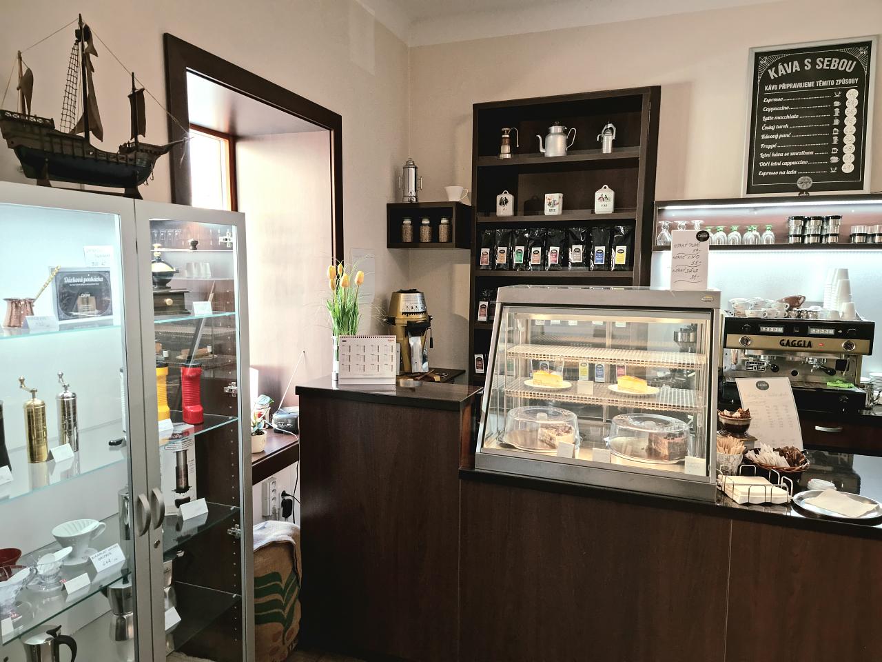 Kromě kávy si můžete vychutnat domácí zákusky, nealkoholické i alkoholické nápoje a zakoupit zrnkovou kávu či dárkové balení.
