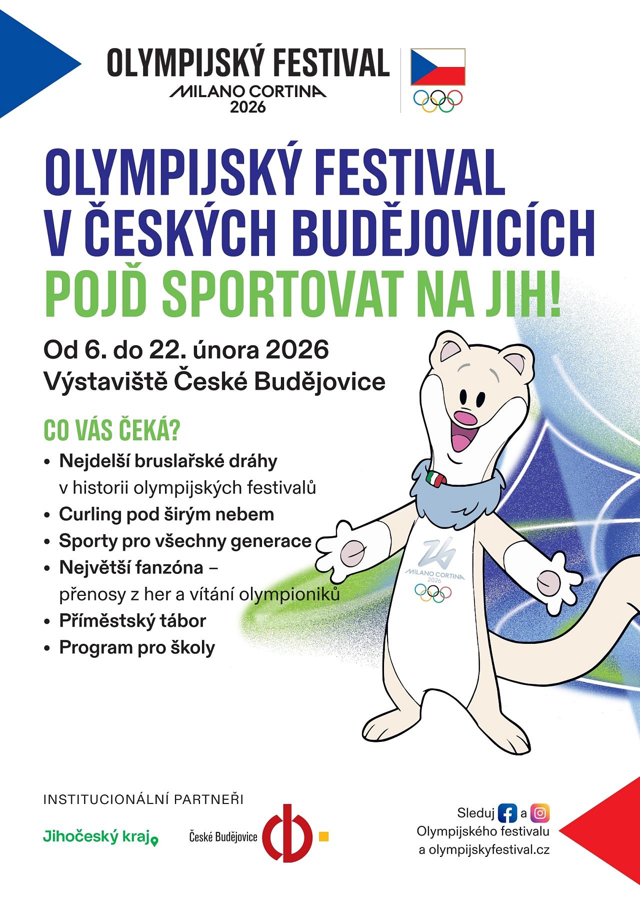 Olympijský festival se uskuteční od 6. do 22. února. Na Výstavišti v Českých Budějovicích vyroste největší olympijská fanzóna a také unikátní areál zimních sportů. Přijďte si vyzkoušet biatlon, curling, skoky na lyžích, bruslařské dráhy a dalších téměř dvacet sportů na jednom místě. Součástí bude i Olympijský dům a půjčovny sportovního vybavení. Nebudou chybět ani autogramiády slavných sportovců a vítání olympioniků. Více informací naleznete na