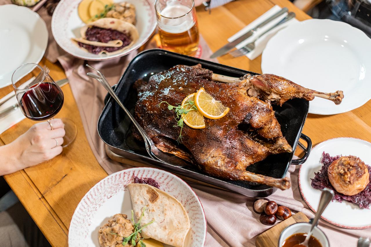 ⦾ 1/4 pečené husy (od Tůmových z Chelčic), dva druhy knedlíků, kaldoun, husí paštika, grilované husí prso, trhaná husa, Renatiny sladké svatomartinské rohlíčky